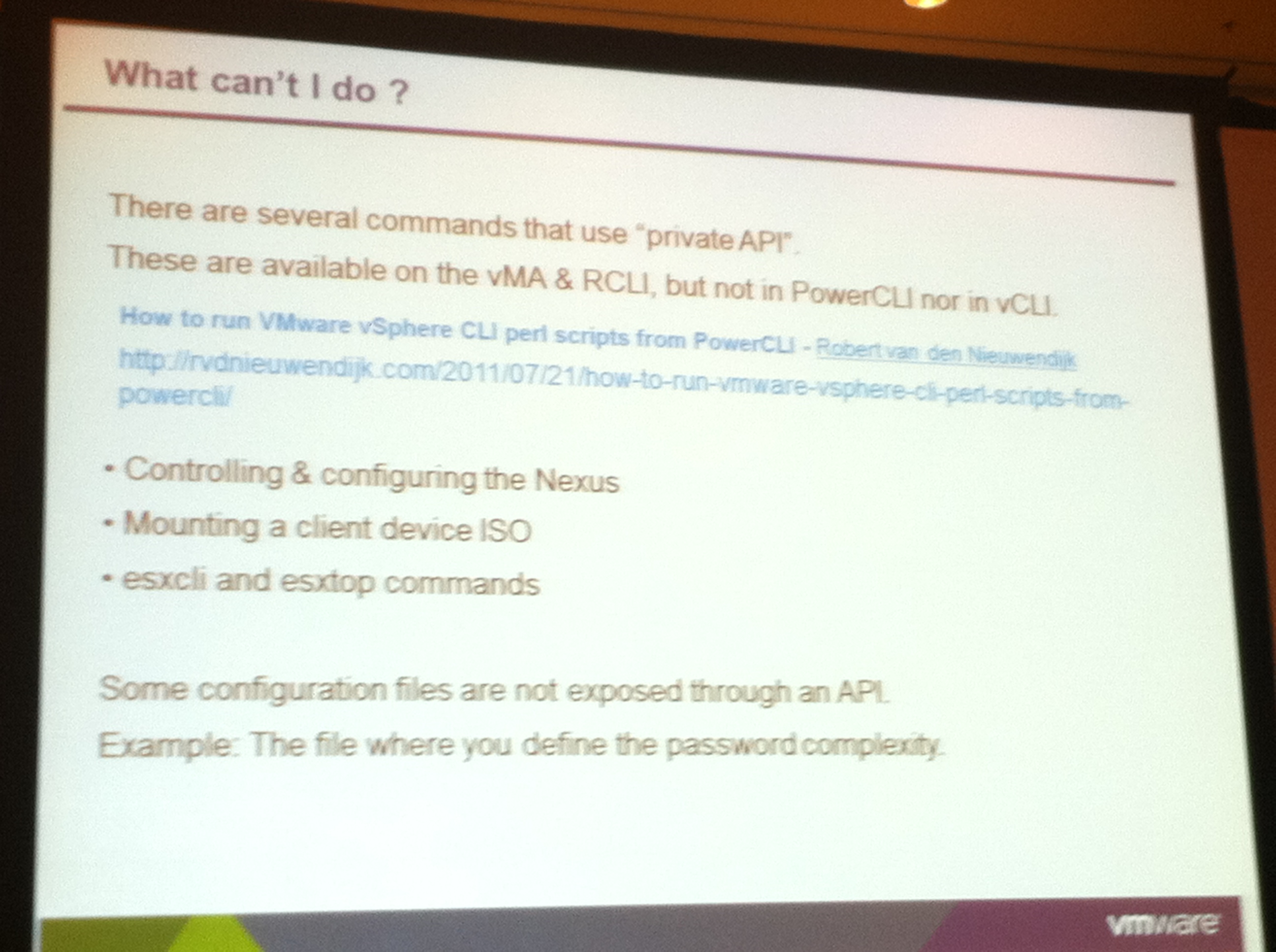 While attending the “VMware vSphere PowerCLI Best Practices” session by Luc Dekens and Alan Renouf I was surprised that suddenly my name was on a slide, with a reference to one of my blog posts. As I only recently started this blog, you can imagine how proud I was.